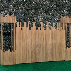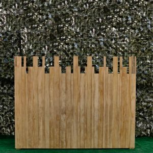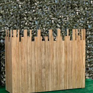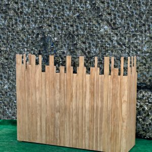 Su nombre, “Desigual”, refleja la esencia de su diseño: un frente compuesto por listones de distintas alturas que generan un efecto visual dinámico y moderno, similar a una muralla de madera asimétrica. Esta estética artesanal y natural se adapta perfectamente a entornos tanto rústicos como contemporáneos, integrándose sin esfuerzo en bodas, festivales, locales de ocio, terrazas o eventos corporativos. Cada pieza se elabora de manera individual, asegurando un acabado impecable y una apariencia visual que transmite originalidad y calidez.