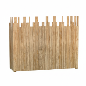 Su nombre, “Desigual”, refleja la esencia de su diseño: un frente compuesto por listones de distintas alturas que generan un efecto visual dinámico y moderno, similar a una muralla de madera asimétrica. Esta estética artesanal y natural se adapta perfectamente a entornos tanto rústicos como contemporáneos, integrándose sin esfuerzo en bodas, festivales, locales de ocio, terrazas o eventos corporativos. Cada pieza se elabora de manera individual, asegurando un acabado impecable y una apariencia visual que transmite originalidad y calidez.