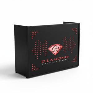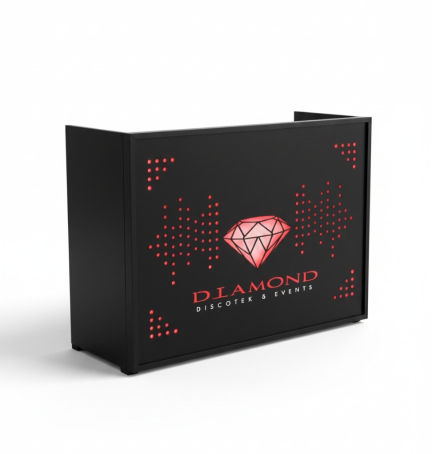 La cabina para DJ troquelada es una mesa de madera resistente, compuesta por tres tableros de madera de pino maciza que conforman una estructura en forma de «U», ofreciendo una estabilidad y resistencia excepcionales. A una altura media-alta de 80 cm, dispone del tablero de apoyo, donde se colocan la mesa de mezclas, el portátil y demás utensilios del DJ. Este tablero cuenta con tres pasacables integrados que facilitan el trabajo del DJ, manteniendo la mesa ordenada y limpia.