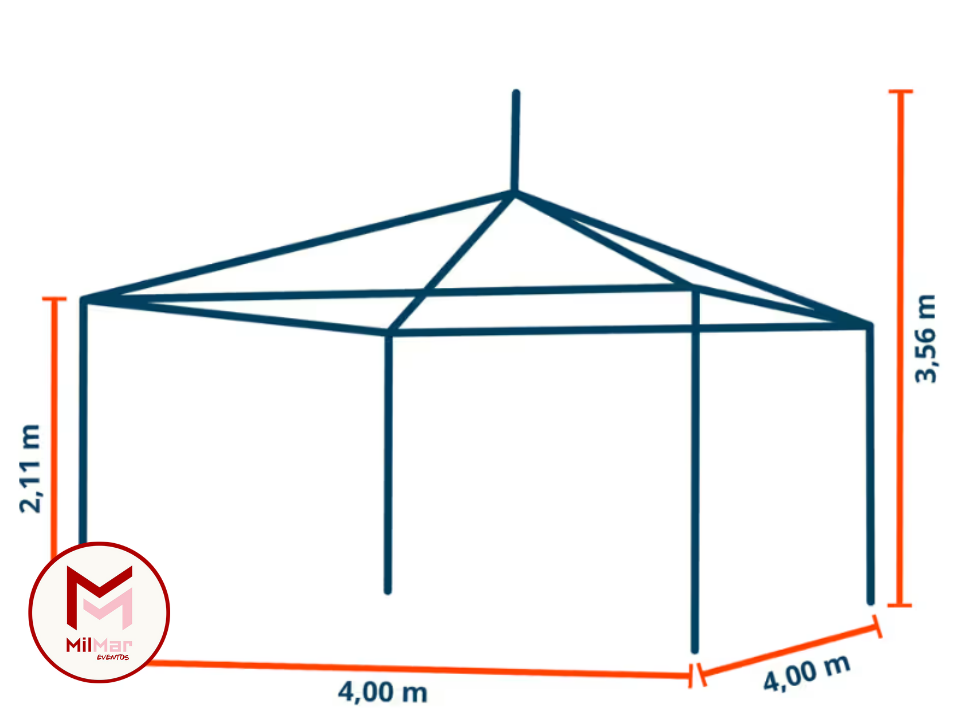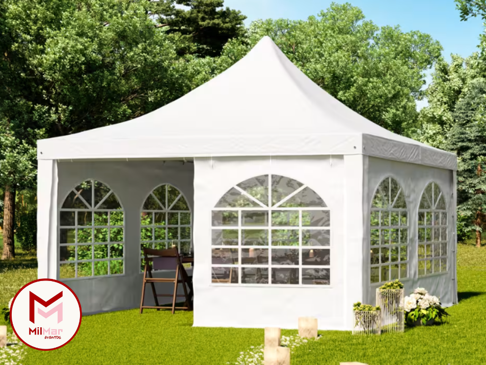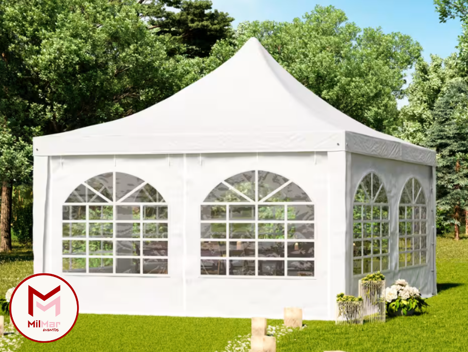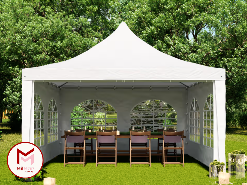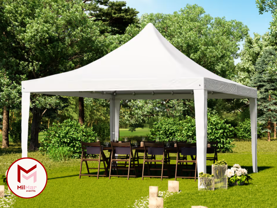 La Carpa Jaima 4×4 m de Eventos Milmar es la combinación perfecta entre diseño elegante, materiales de alta calidad y facilidad de montaje. Ideal para eventos corporativos, celebraciones privadas, puntos de venta, zonas de recepción, stands promocionales o cualquier actividad al aire libre que requiera una estructura resistente y visualmente atractiva. Su característico techo elevado en forma de pagoda proporciona un toque distintivo que enriquece cualquier ambiente, a la vez que asegura una excelente funcionalidad.