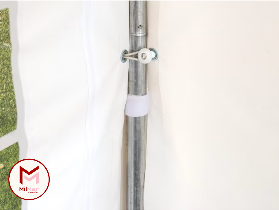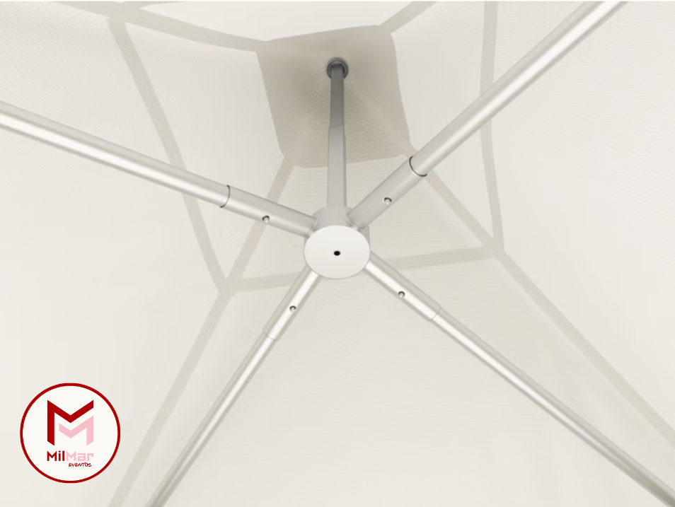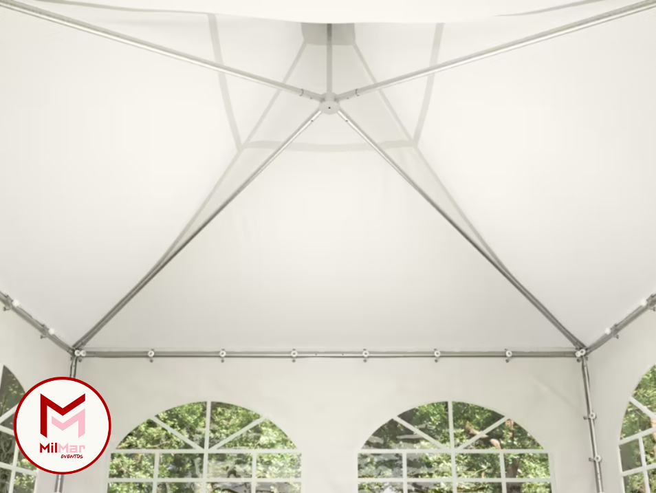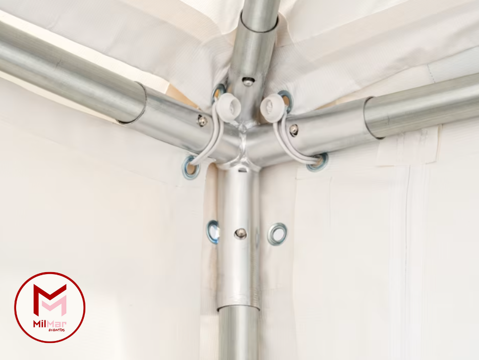 Este sistema permite que la Carpa Jaima 4×4 m resista condiciones climatológicas variables, manteniéndose estable en eventos prolongados o días ventosos.
