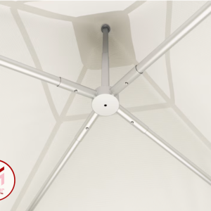 El elegante pico superior, distintivo de las carpas tipo jaima, está compuesto por tres piezas que se unen y atornillan entre sí. Su fuerte muelle interior permite que la lona se tense de forma automática, evitando arrugas y garantizando una estética perfecta.