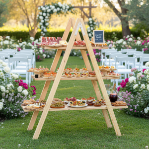 Puede ser utilizada como mesa de degustación o candy bar, facilitando la disposición de diversos productos o dulces en sus tres niveles, lo cual permite una presentación accesible y visualmente atractiva.