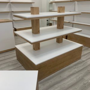 El mueble central de exhibición combina un diseño tipo pirámide exhibidora con materiales de primera calidad. Su estética limpia, con líneas modernas y una combinación armoniosa entre la madera natural y los tonos neutros, encaja perfectamente en tiendas de moda, panaderías, fruterías, perfumerías, boutiques, ferias comerciales o exposiciones temporales.