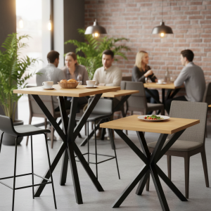 El diseño de patas cruzadas aporta dinamismo y estabilidad, y el tablero de madera ofrece un contraste natural que transmite calidez y calidad. Es una pieza moderna, elegante y funcional que, en conjunto, crea un ambiente agradable y con personalidad.