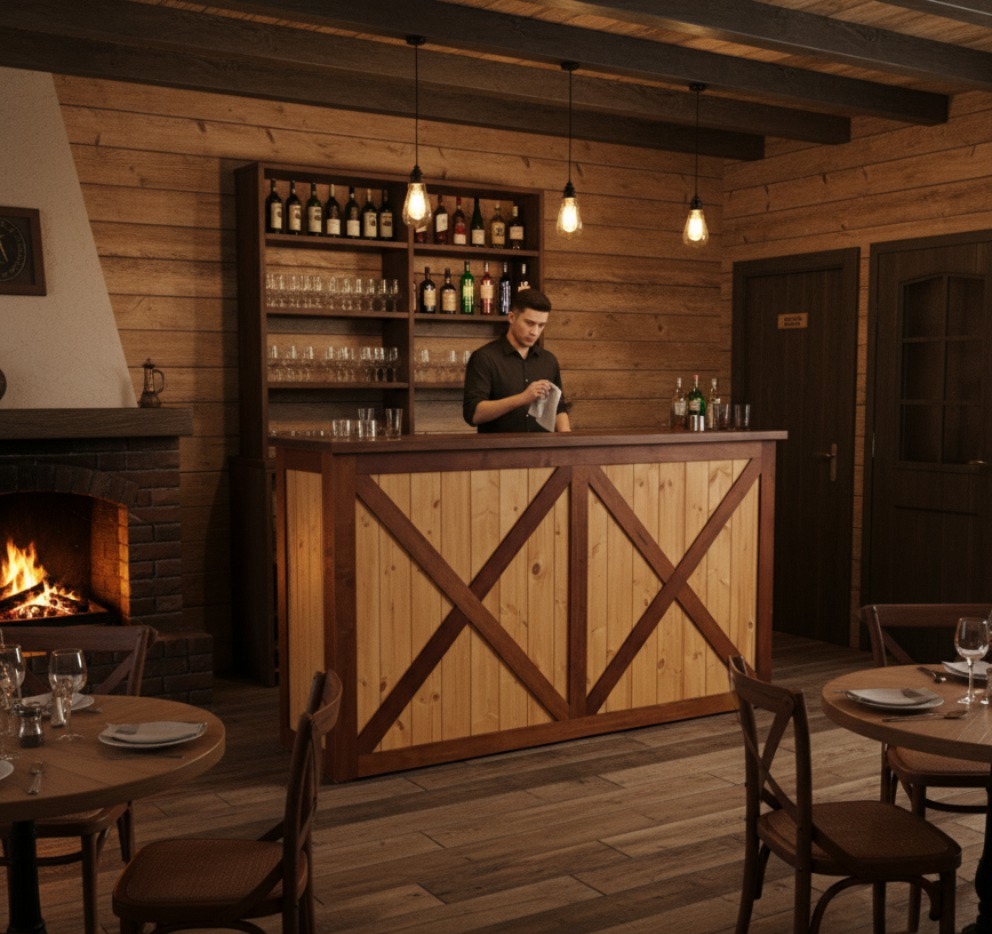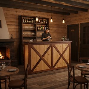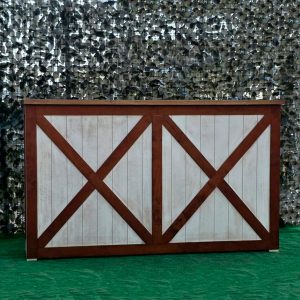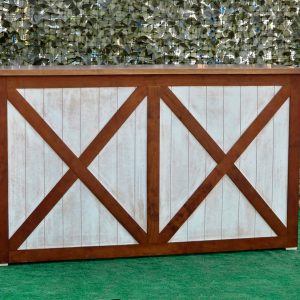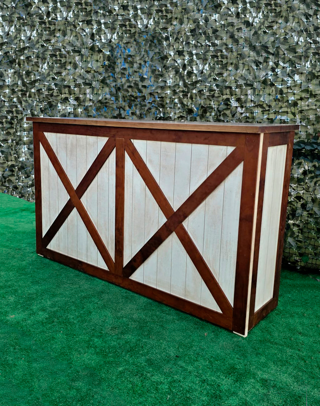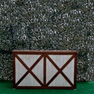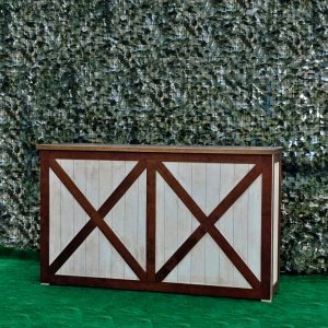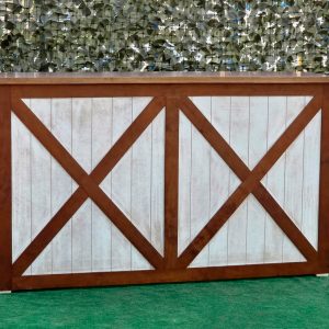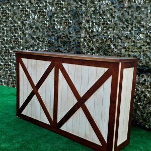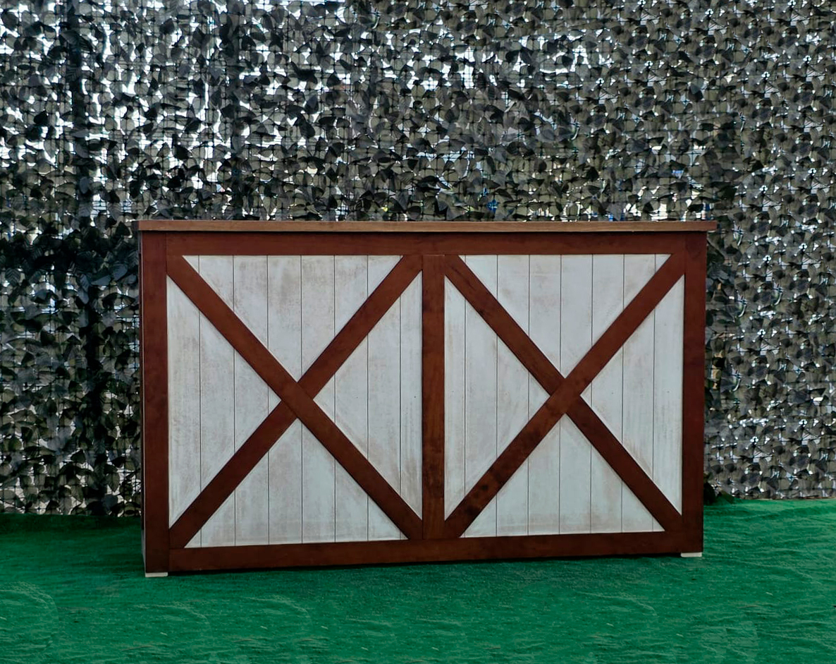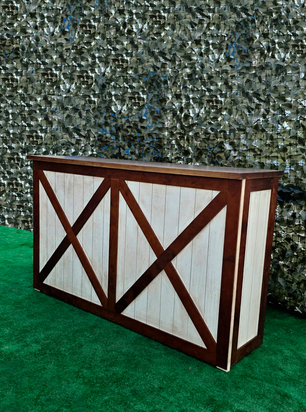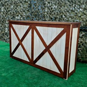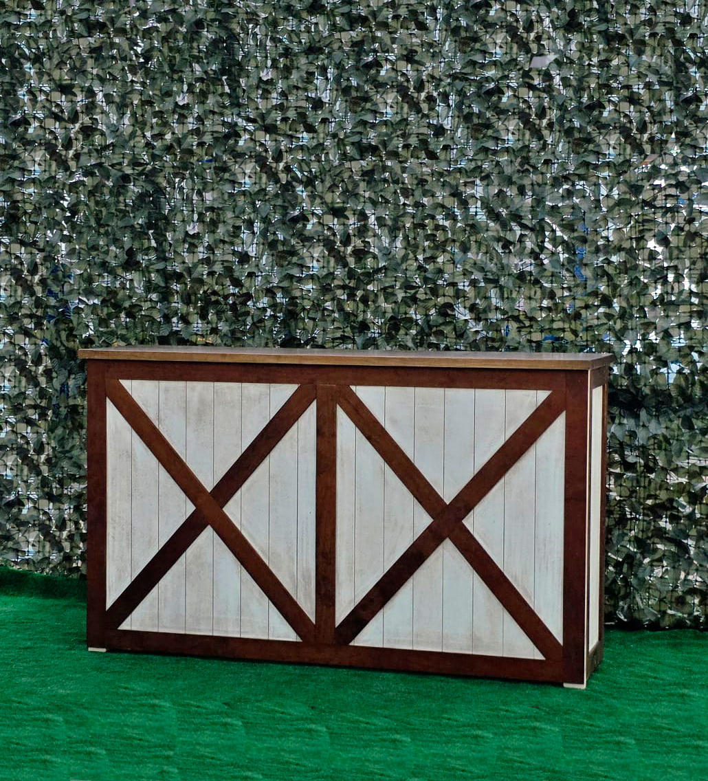 La estructura de la barra está elaborada en madera maciza cuidadosamente seleccionada para garantizar durabilidad y estabilidad. Su diseño presenta un marco en forma de “X” en los paneles frontales y laterales, lo que le otorga un aire rústico-industrial muy atractivo y actual. Este estilo se inspira en las puertas tipo granero o “barn door”, aportando una estética campestre pero elegante que combina perfectamente con entornos tanto tradicionales como modernos.