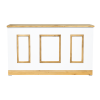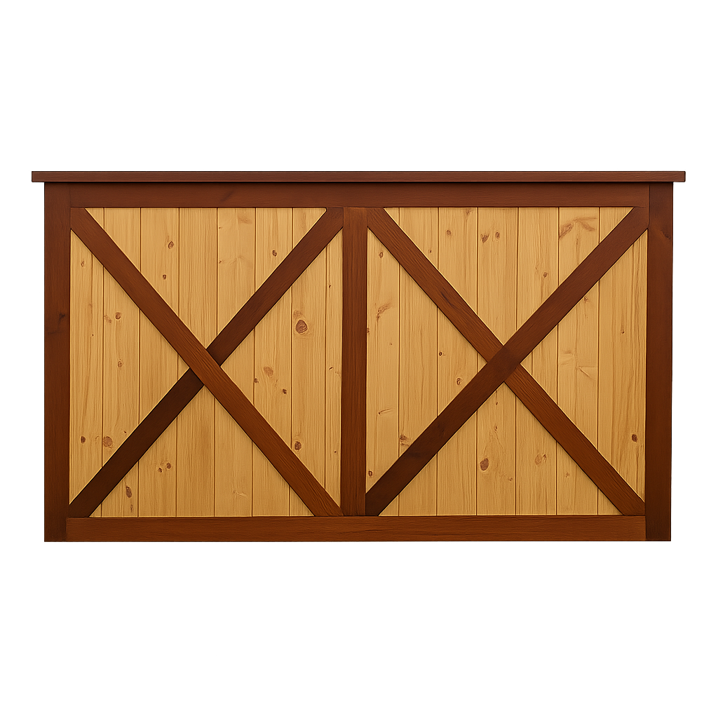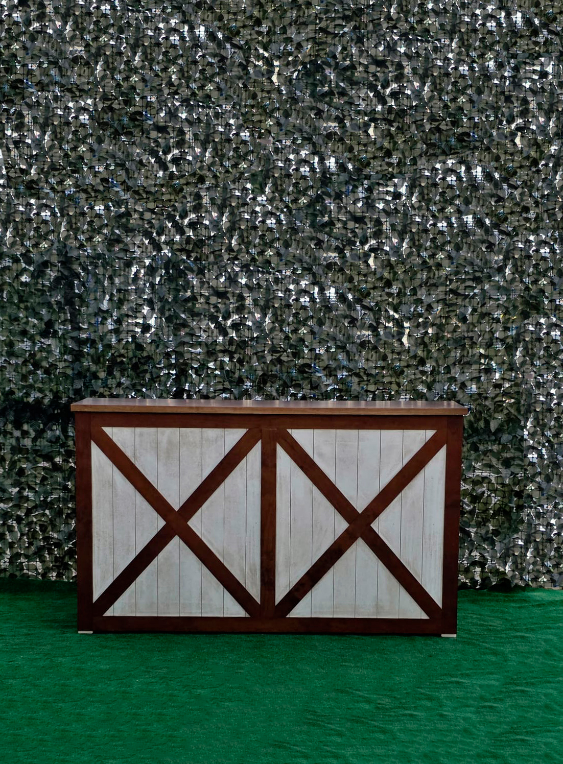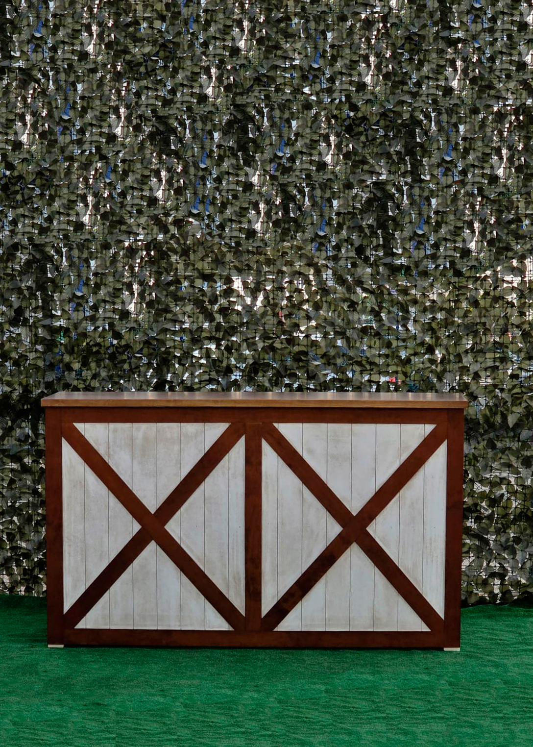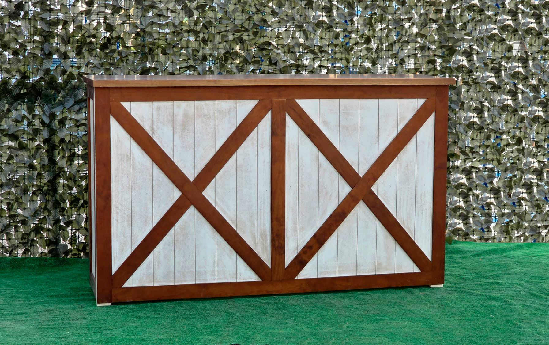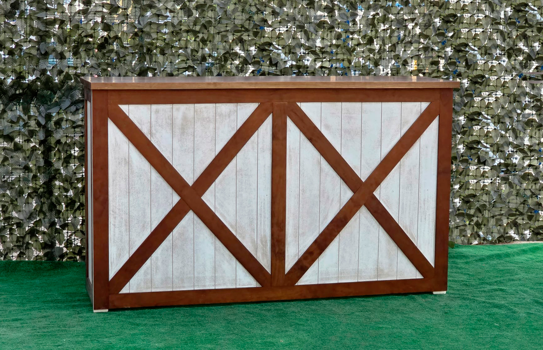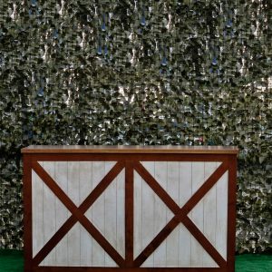 La estructura de la barra está elaborada en madera maciza cuidadosamente seleccionada para garantizar durabilidad y estabilidad. Su diseño presenta un marco en forma de “X” en los paneles frontales y laterales, lo que le otorga un aire rústico-industrial muy atractivo y actual. Este estilo se inspira en las puertas tipo granero o “barn door”, aportando una estética campestre pero elegante que combina perfectamente con entornos tanto tradicionales como modernos.