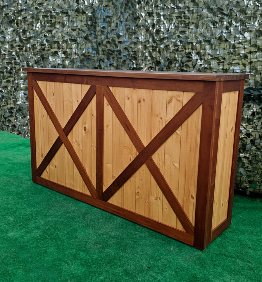 El acabado estándar incluye una combinación de colores en contraste: madera oscura en el marco y tono más claro en las tablas interiores, creando un equilibrio visual armónico y sofisticado. No obstante, ofrecemos la posibilidad de personalizar el color y el acabado según tus preferencias o la identidad visual de tu negocio. Puedes elegir entre tonos naturales, envejecidos, lacados o pintados, adaptando la barra a tu estilo personal o a la temática del evento.