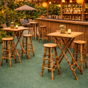 Taburetes de bambú: confort y versatilidad – PACK MESA ALTA PLEGABLE BAMBÚ + 4 TABURETES BAMBÚ
