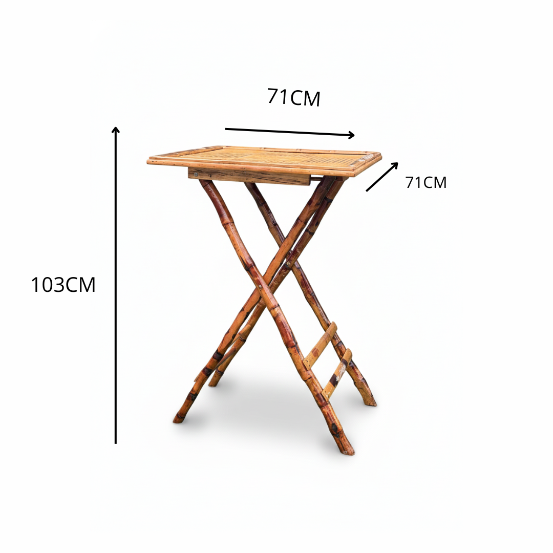 La mesa plegable alta de bambú incluida en este pack combina diseño artesanal y practicidad. Sus medidas de 70 × 70 × 110 cm la hacen perfecta para reuniones, celebraciones y eventos al aire libre.