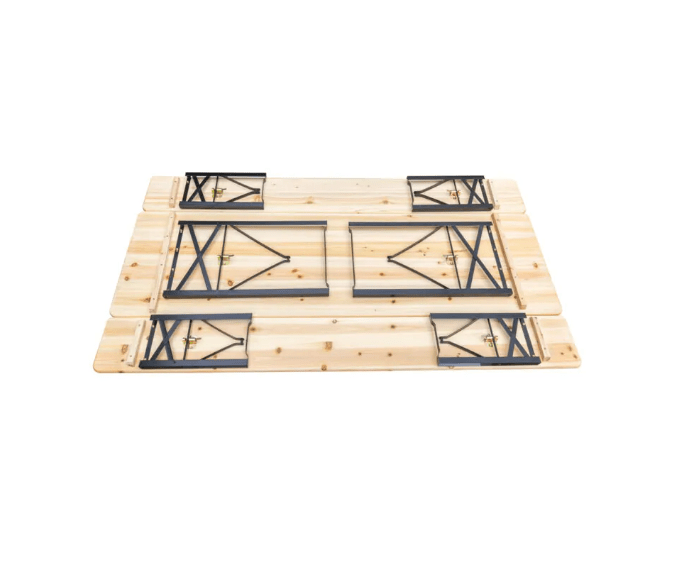 El tablero y los asientos están elaborados en madera de pino, un material conocido por su resistencia natural y su estética atemporal. Con un grosor de 24 mm, la superficie se mantiene robusta y resistente a lo largo del tiempo, incluso en entornos exteriores.