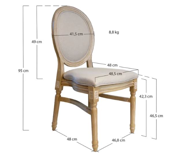 Estas medidas hacen que sea una silla versátil, apta tanto para mesas redondas como rectangulares, y con una altura ideal para eventos de catering o uso doméstico.