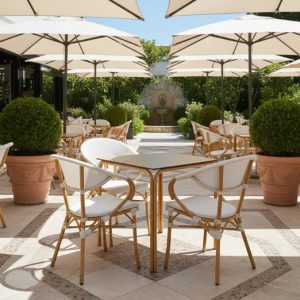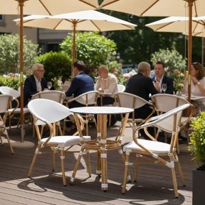 Con un diseño clásico y una elegancia atemporal, el Sillón Nantes es una pieza inspirada en los emblemáticos cafés parisinos del siglo XIX. Su estructura de aluminio con acabado en imitación ratán captura la esencia del mobiliario bistró, aportando un estilo único que se adapta a cualquier entorno, ya sea moderno o tradicional.